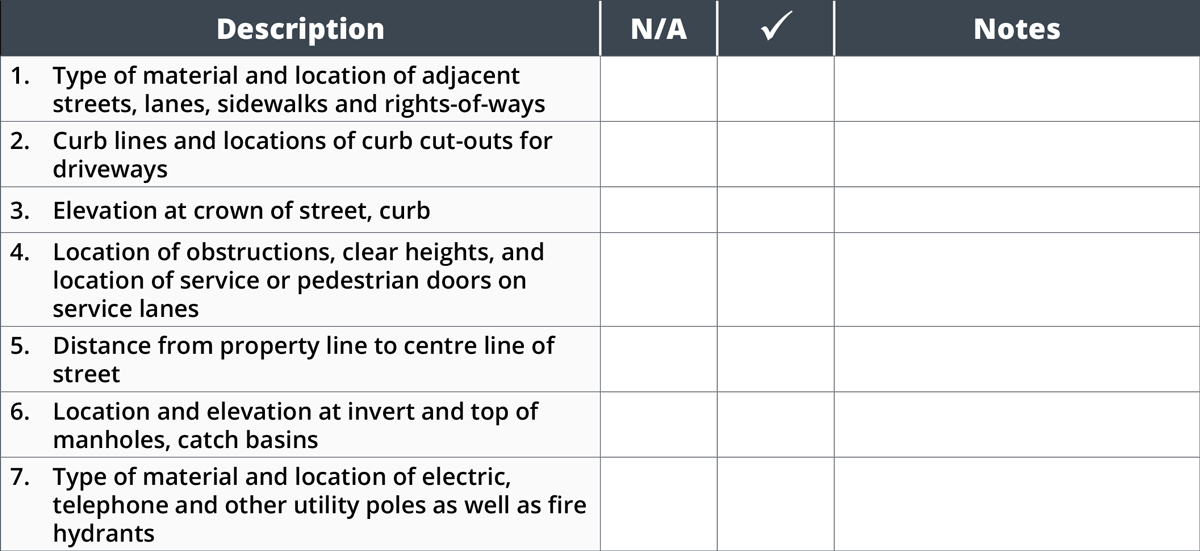This checklist is meant to assist the architect in providing instructions to a land surveyor by identifying the requirements needed when they are engaged to prepare a survey of a particular site. Generally speaking, land surveys will indicate location and description of any features that would affect construction as well as all easements, alignment restrictions or other special zoning or town planning information, which might determine the location of the building on the property. Local authorities having jurisdiction may have particular checklists of information they require on surveys too.