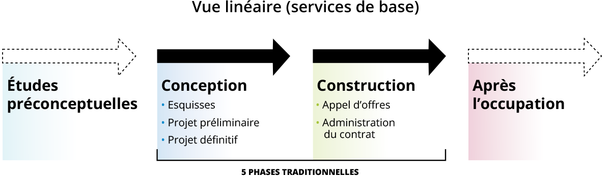 Pour une description complète des services d’architecture envisagés pour chaque phase du projet, voir la Formule canadienne normalisée de contrat pour les services de l’architecte, Document Six de l’IRAC, le Guide aidant à déterminer les honoraires appropriés pour les services de l’architecte publié par l’IRAC et les chapitres de la partie 5 – Gestion du projet de conception et de la partie 6 – Phases du projet de conception du présent Manuel.