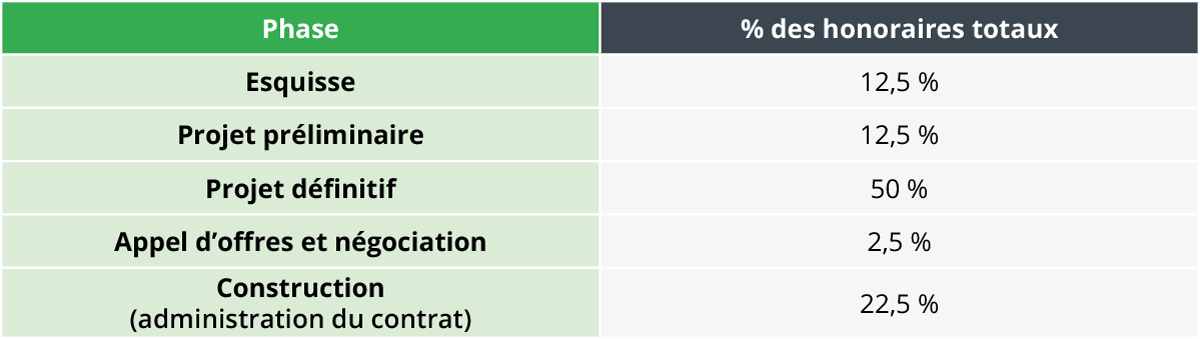 Le calcul des honoraires selon le mode traditionnel de réalisation d’un projet en cinq phases s’établit comme suit :
