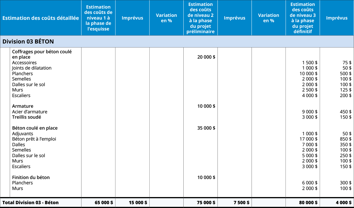 La ventilation permet une présentation cohérente des données d’estimation des coûts, car les estimations sont de plus en plus détaillées.