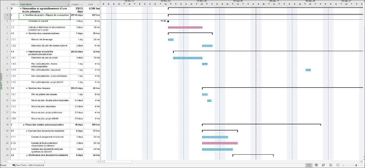 Les calendriers de projet sont des outils de planification qui aident l’architecte et les équipes de projet à organiser diverses tâches définies pour respecter les délais fixés par les attentes du client et les obligations contractuelles. En outre, les calendriers permettent de suivre l’avancement des tâches jusqu’à l’achèvement du projet. Comme il existe diverses techniques de planification pour de nombreux types de projets, le gestionnaire de projet doit choisir une méthode qui peut être adaptée à l’ampleur et à la complexité du travail. Le présent chapitre passe en revue les outils de base de la planification de calendrier couramment utilisés dans la gestion des projets de conception.